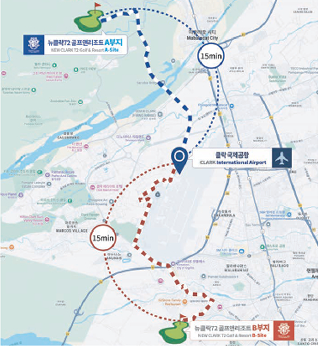 한국에서 클락 국제공항까지 3시간 30분, 공항에서 로얄센트럴 G.C까지